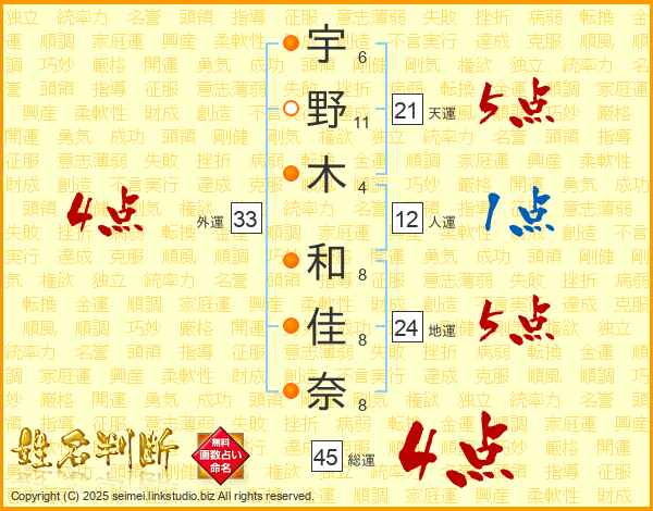 宇野木和佳奈さんの天運は21画の5点!
