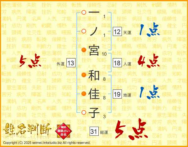 一ノ宮和佳子さんの総運は31画の5点!