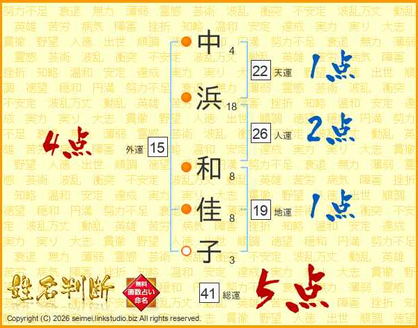 中(4画)浜(18画) 和(8画)佳(8画)子(3画)