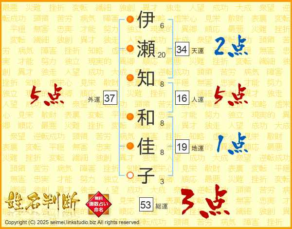 伊(6画)瀬(20画)知(8画) 和(8画)佳(8画)子(3画)