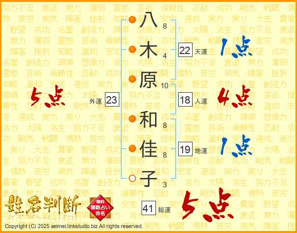 八(8画)木(4画)原(10画) 和(8画)佳(8画)子(3画)