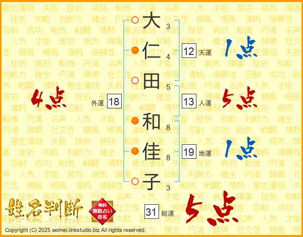 大(3画)仁(4画)田(5画) 和(8画)佳(8画)子(3画)