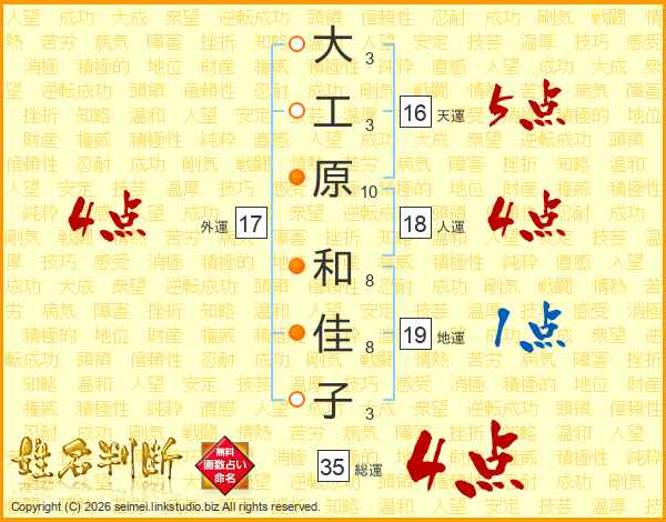 大(3画)工(3画)原(10画) 和(8画)佳(8画)子(3画)