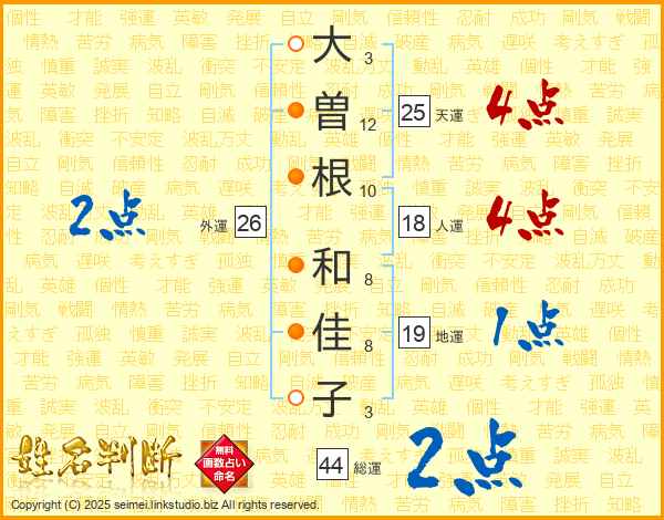 大(3画)曽(12画)根(10画) 和(8画)佳(8画)子(3画)