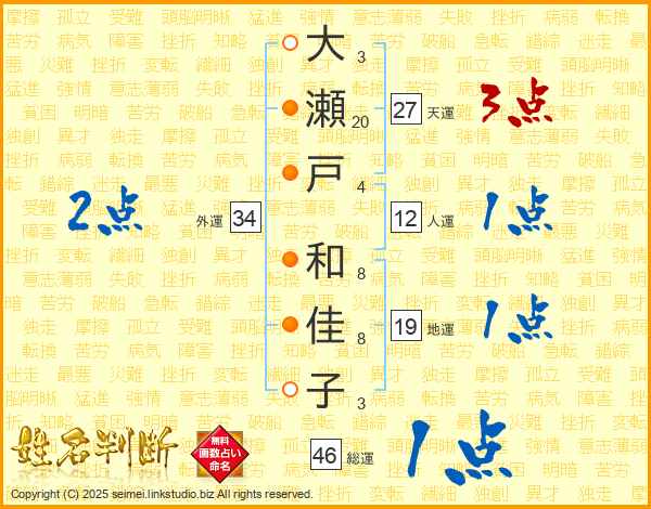 大(3画)瀬(20画)戸(4画) 和(8画)佳(8画)子(3画)