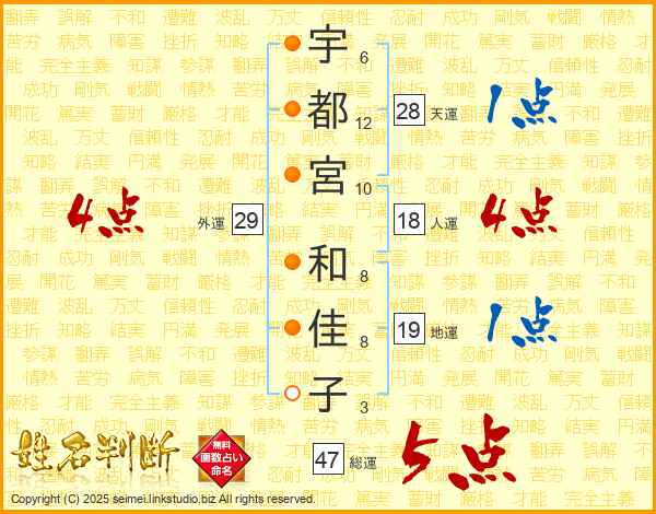 宇(6画)都(12画)宮(10画) 和(8画)佳(8画)子(3画)