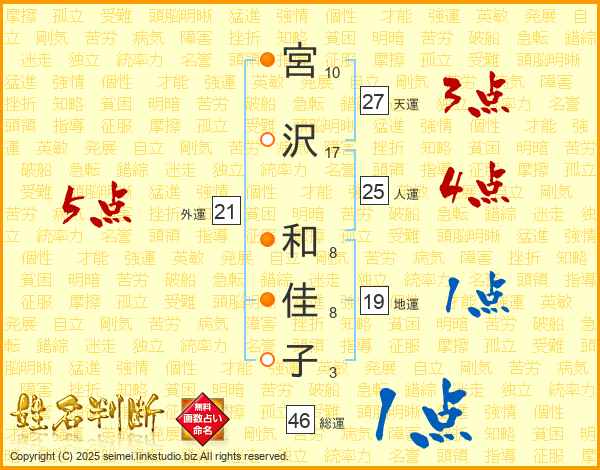 宮(10画)沢(17画) 和(8画)佳(8画)子(3画)