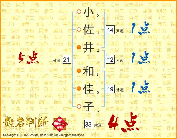 小佐井和佳子さんの総運は33画の4点!