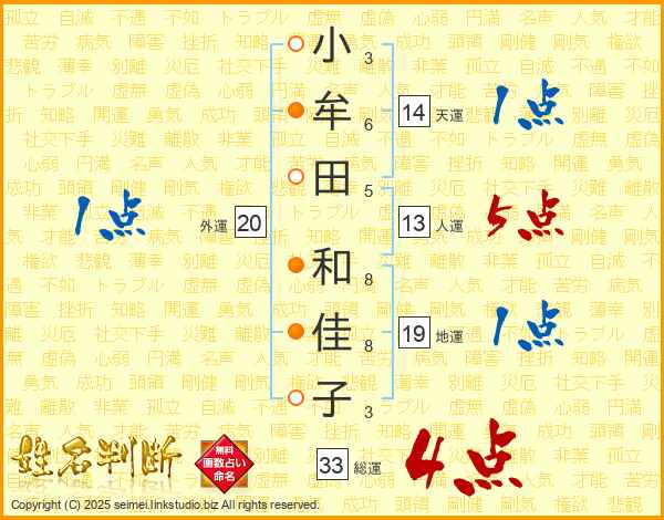 小(3画)牟(6画)田(5画) 和(8画)佳(8画)子(3画)