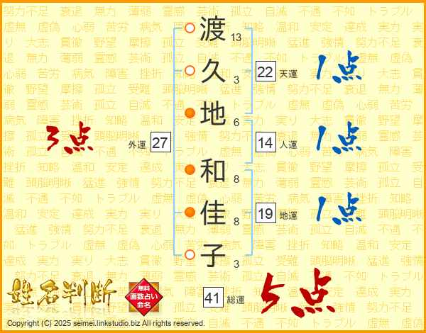 渡(13画)久(3画)地(6画) 和(8画)佳(8画)子(3画)