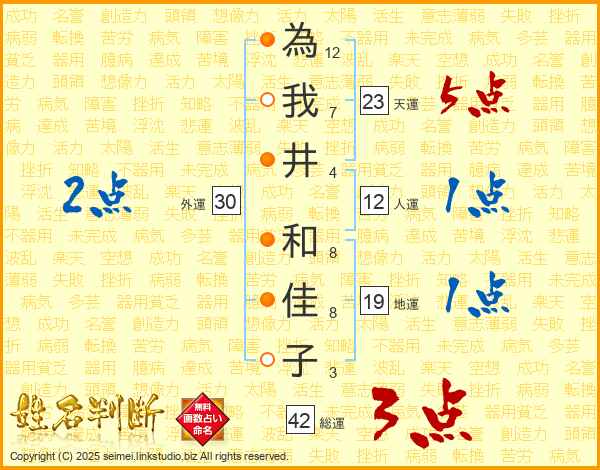 為(12画)我(7画)井(4画) 和(8画)佳(8画)子(3画)