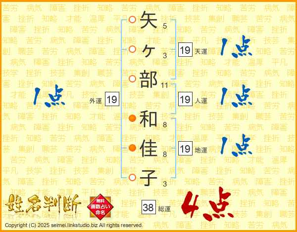 矢(5画)ヶ(3画)部(11画) 和(8画)佳(8画)子(3画)