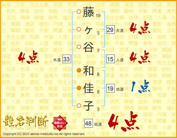 藤(19画)ヶ(3画)谷(7画) 和(8画)佳(8画)子(3画)
