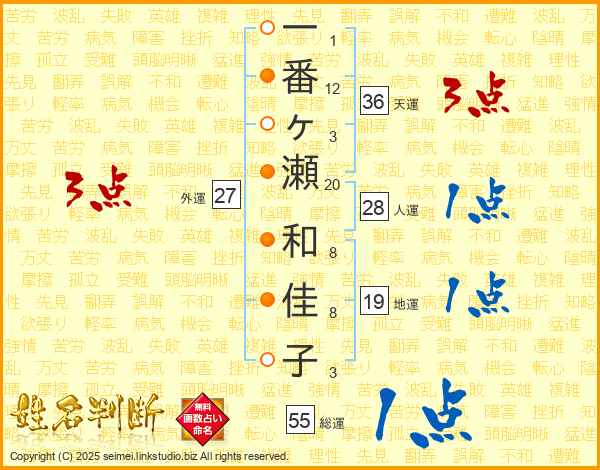 一(1画)番(12画)ヶ(3画)瀬(20画) 和(8画)佳(8画)子(3画)