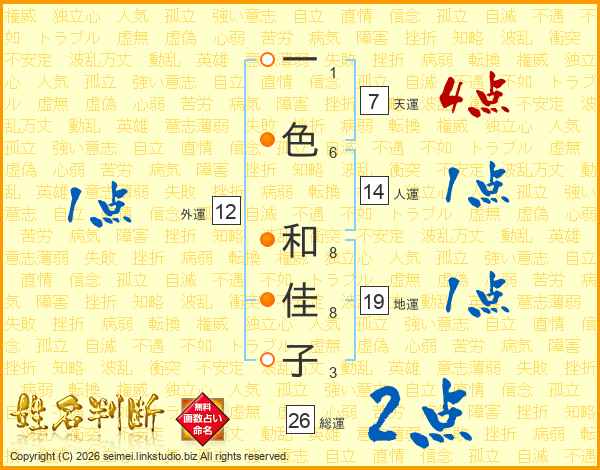 一(1画)色(6画) 和(8画)佳(8画)子(3画)