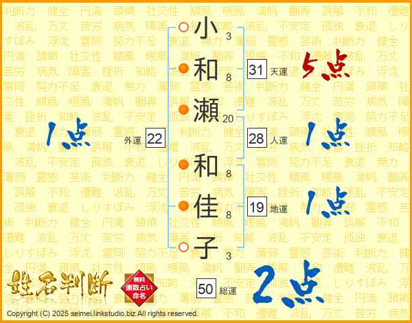 小(3画)和(8画)瀬(20画) 和(8画)佳(8画)子(3画)