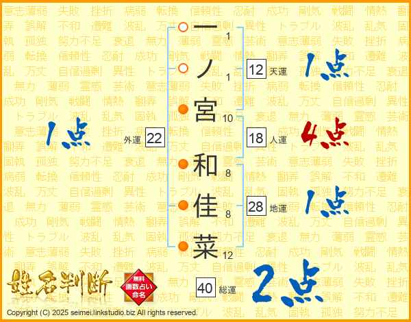 一(1画)ノ(1画)宮(10画) 和(8画)佳(8画)菜(12画)