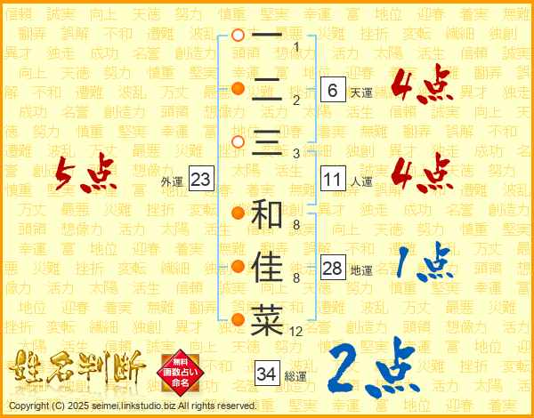 生活面を象徴する運勢です。外部から受ける影響力を表し、結婚運、家庭運や職場、環境への順応性を表します。総運から人運を引いた画数。姓や名が1文字の場合を除く。