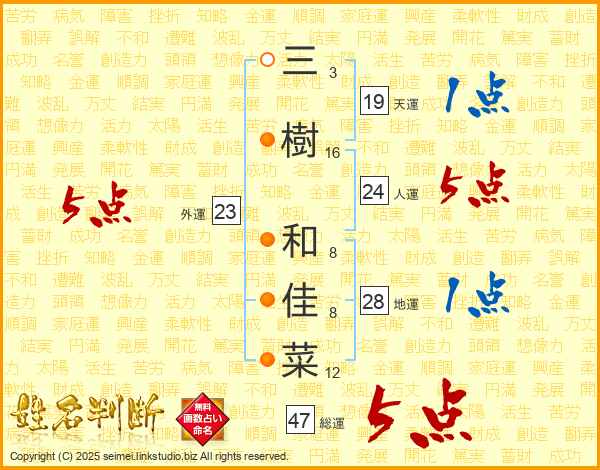 三(3画)樹(16画) 和(8画)佳(8画)菜(12画)