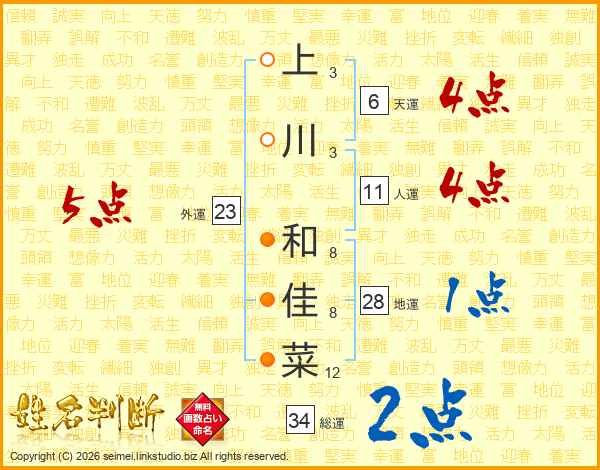 上(3画)川(3画) 和(8画)佳(8画)菜(12画)