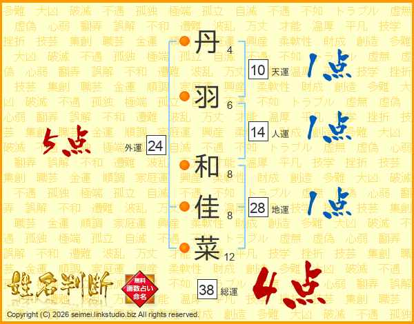 丹(4画)羽(6画) 和(8画)佳(8画)菜(12画)