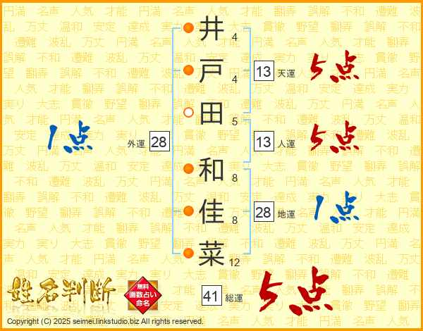 井(4画)戸(4画)田(5画) 和(8画)佳(8画)菜(12画)