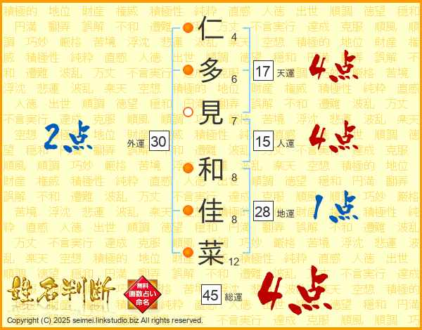 仁(4画)多(6画)見(7画) 和(8画)佳(8画)菜(12画)