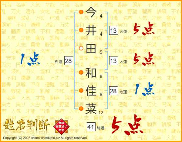 今(4画)井(4画)田(5画) 和(8画)佳(8画)菜(12画)