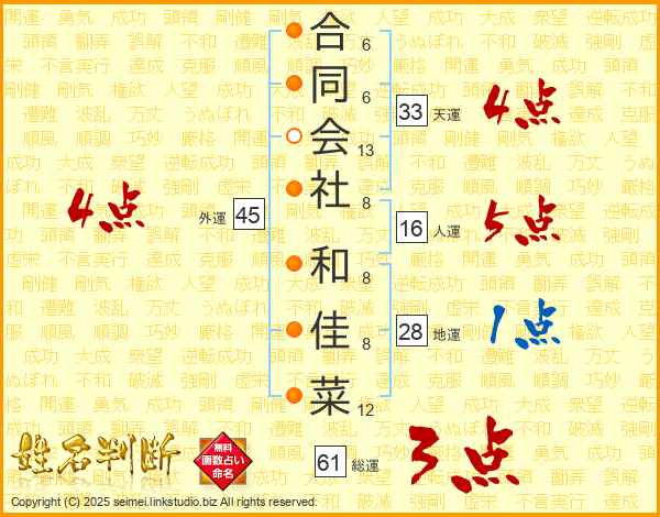 生活面を象徴する運勢です。外部から受ける影響力を表し、結婚運、家庭運や職場、環境への順応性を表します。総運から人運を引いた画数。姓や名が1文字の場合を除く。