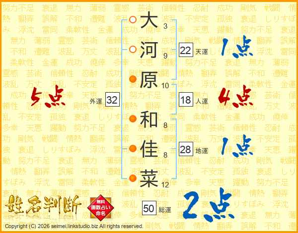 大(3画)河(9画)原(10画) 和(8画)佳(8画)菜(12画)