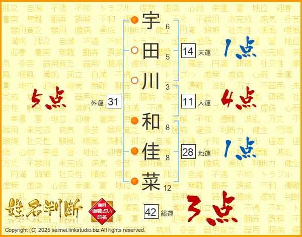 宇(6画)田(5画)川(3画) 和(8画)佳(8画)菜(12画)
