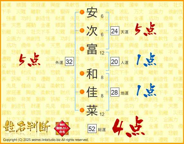 安次富和佳菜さんの総運は52画の4点!