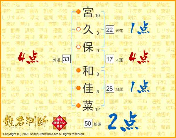 宮(10画)久(3画)保(9画) 和(8画)佳(8画)菜(12画)