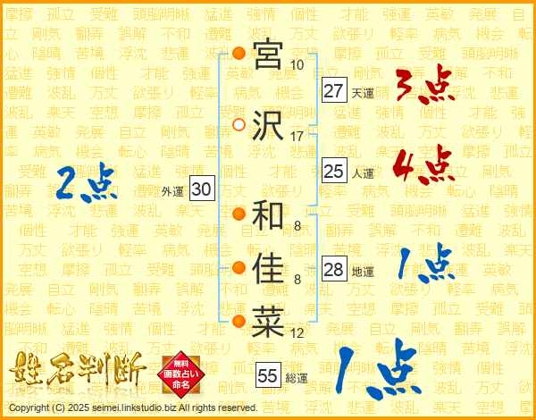 宮(10画)沢(17画) 和(8画)佳(8画)菜(12画)