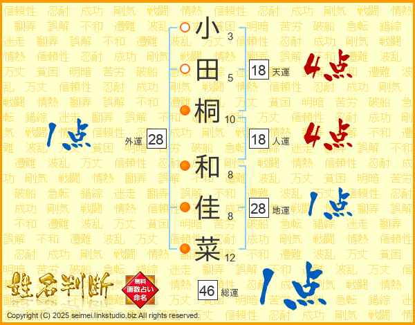 小(3画)田(5画)桐(10画) 和(8画)佳(8画)菜(12画)