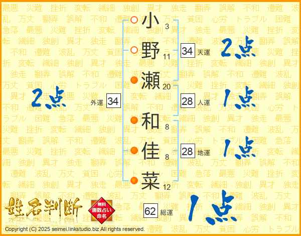 小(3画)野(11画)瀬(20画) 和(8画)佳(8画)菜(12画)
