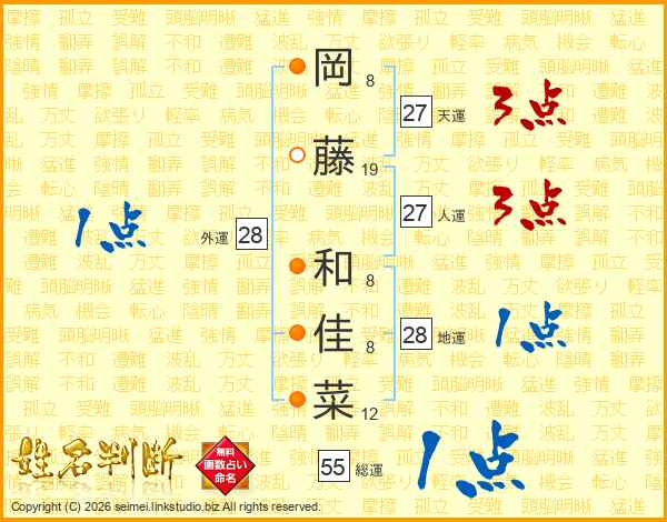 岡(8画)藤(19画) 和(8画)佳(8画)菜(12画)