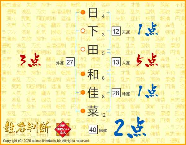 日(4画)下(3画)田(5画) 和(8画)佳(8画)菜(12画)