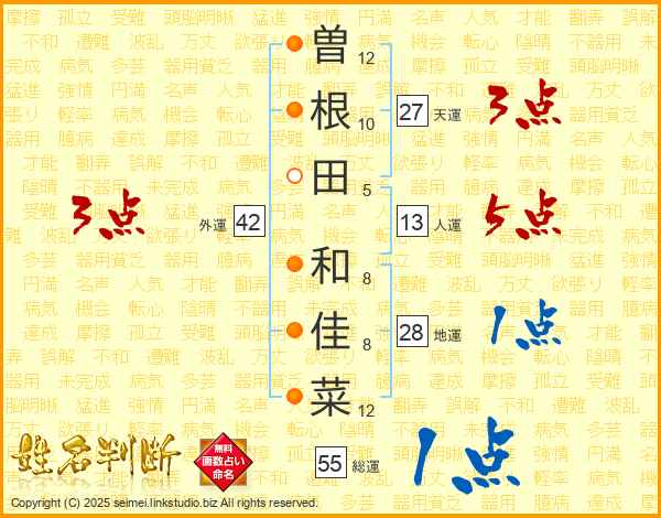 曽(12画)根(10画)田(5画) 和(8画)佳(8画)菜(12画)