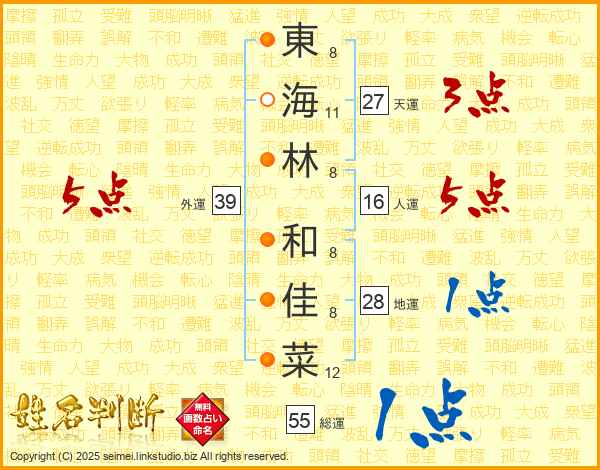 東(8画)海(11画)林(8画) 和(8画)佳(8画)菜(12画)