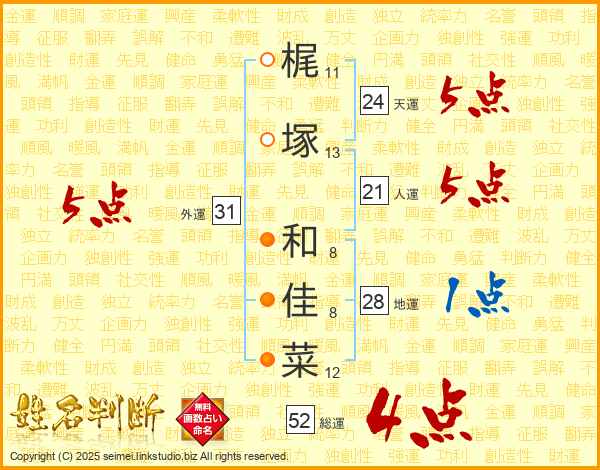 梶(11画)塚(13画) 和(8画)佳(8画)菜(12画)
