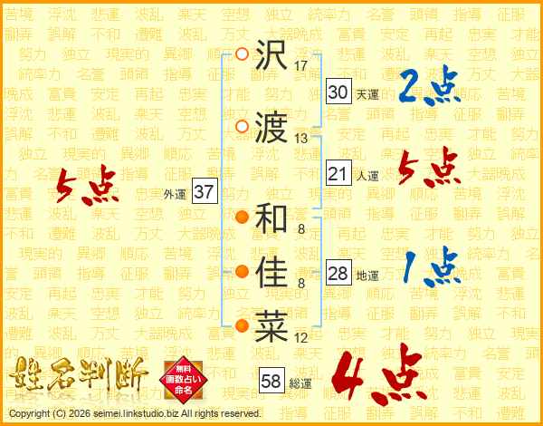 沢(17画)渡(13画) 和(8画)佳(8画)菜(12画)