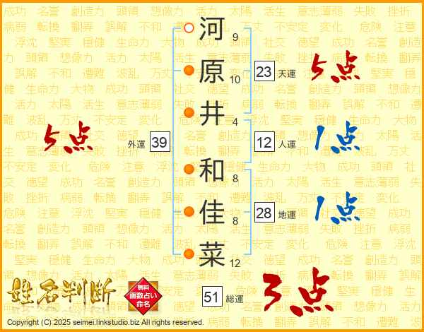 河(9画)原(10画)井(4画) 和(8画)佳(8画)菜(12画)
