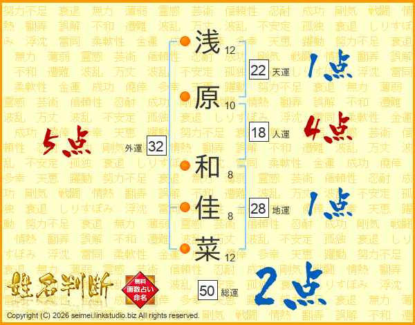 浅(12画)原(10画) 和(8画)佳(8画)菜(12画)