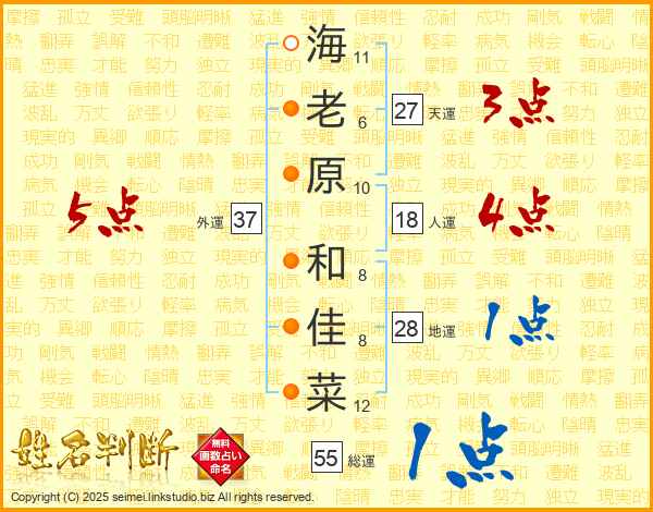 海(11画)老(6画)原(10画) 和(8画)佳(8画)菜(12画)