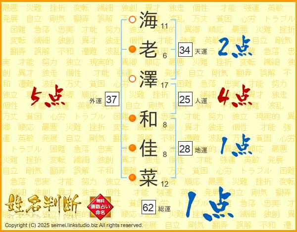海(11画)老(6画)澤(17画) 和(8画)佳(8画)菜(12画)