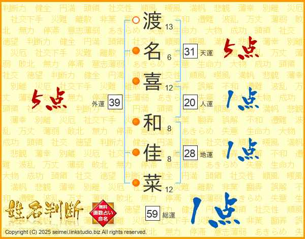 渡(13画)名(6画)喜(12画) 和(8画)佳(8画)菜(12画)