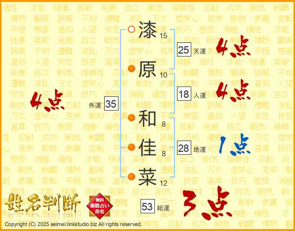漆(15画)原(10画) 和(8画)佳(8画)菜(12画)