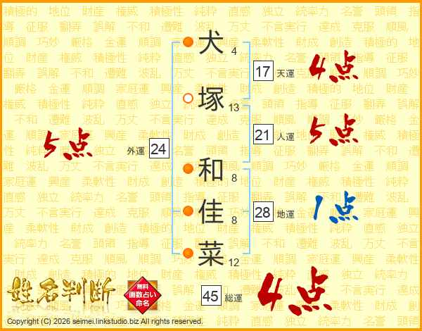 犬(4画)塚(13画) 和(8画)佳(8画)菜(12画)