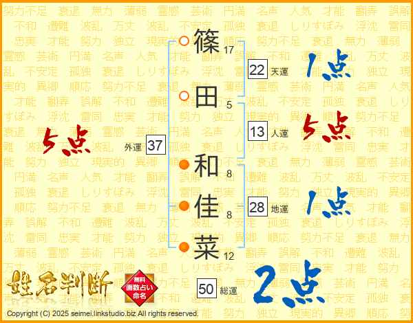 篠(17画)田(5画) 和(8画)佳(8画)菜(12画)
